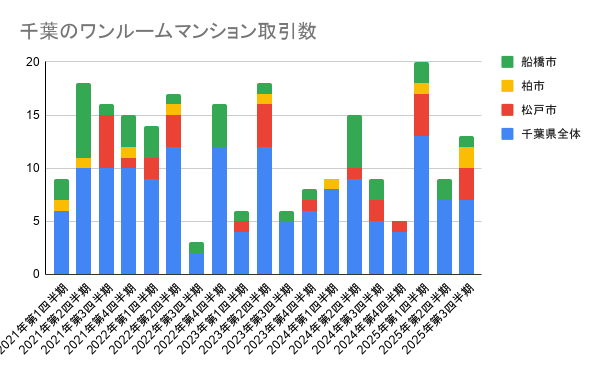 千葉県内の不動産情報ライブラリのデータを分析すると、成約件数が伸びている一方で、新規に売り出される物件が追いついていない「在庫不足」の傾向が見て取れます。これが価格上昇の主因となっており、市場全体では「出せば売れる」状況に近いエリアも存在します。ワンルーム市場についても同様で、特に投資効率の良い物件はすぐに成約に至るため、平均成約価格が押し上げられています。市場は非常に引き締まった需給バランスを維持しています。