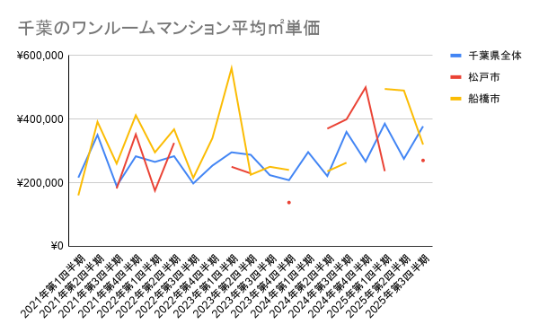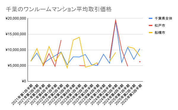 国土交通省が提供しているデータ「不動産情報ライブラリ」より、ワンルームマンションの成約価格に関する情報のみを抽出しました。2025年第三四半期の平均売却価格について調べたところ、千葉全体で10,400,000円という数字が出ています。